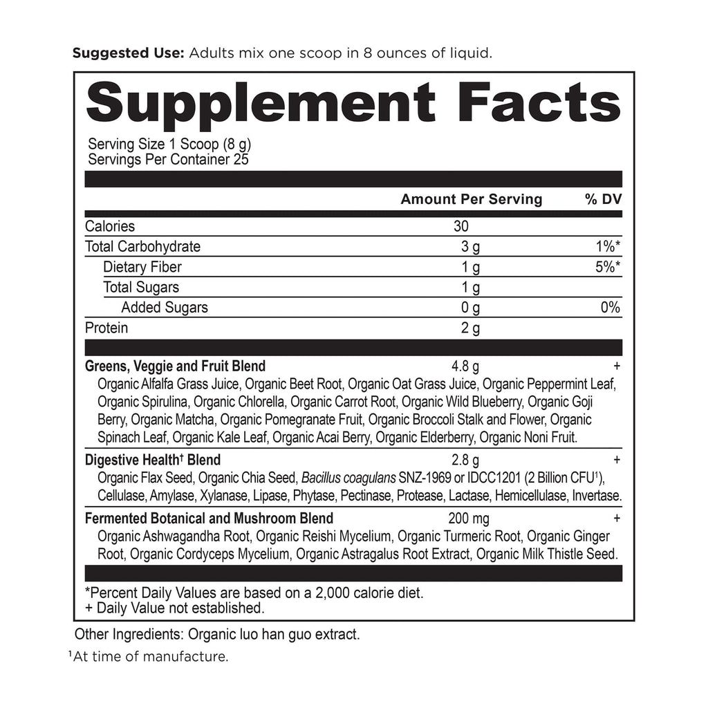 Greens, Veggie and Fruit Blend Organic Alfalfa Grass Juice, Organic Beet Root, Organic Oat Grass Juice, Organic Peppermint Leaf Powder, Organic Spirulina, Organic Chlorella, Organic Carrot Root, Organic Wild Blueberry, Organic Goji Berry, Organic Matcha Powder, Organic Pomegranate Fruit, Organic Broccoli Stalk and Flower, Organic Spinach Leaf, Organic Kale Leaf, Organic Acai Berry, Organic Elderberry, Organic Noni Fruit |