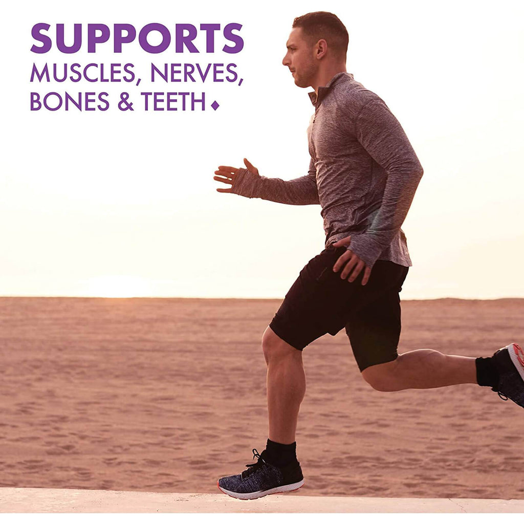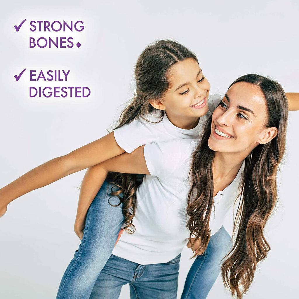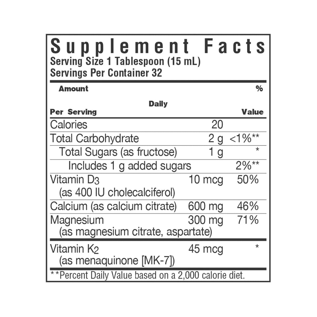 Calories 20, Total Carbohydrate 2 g, Sugars (as fructose) 1 g, Includes 1 g added sugars, Vitamin D3 (as 400 IU cholecalciferol) 10 mcg, Vitamin K2 (as menaquinone [MK-7]) 45 mcg, Calcium (as calcium citrate) 600 mg, Magnesium (as magnesium, citrate, aspartate) 300 mg.