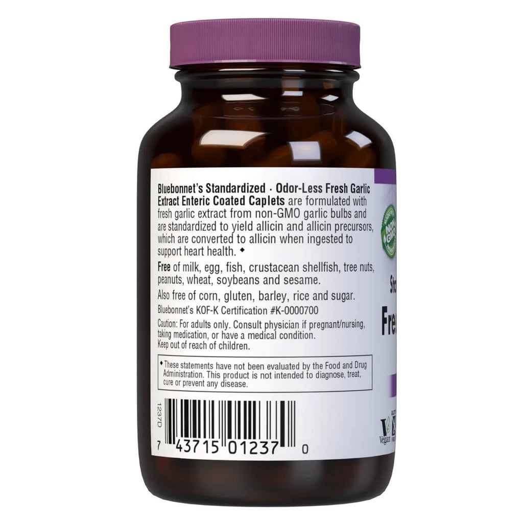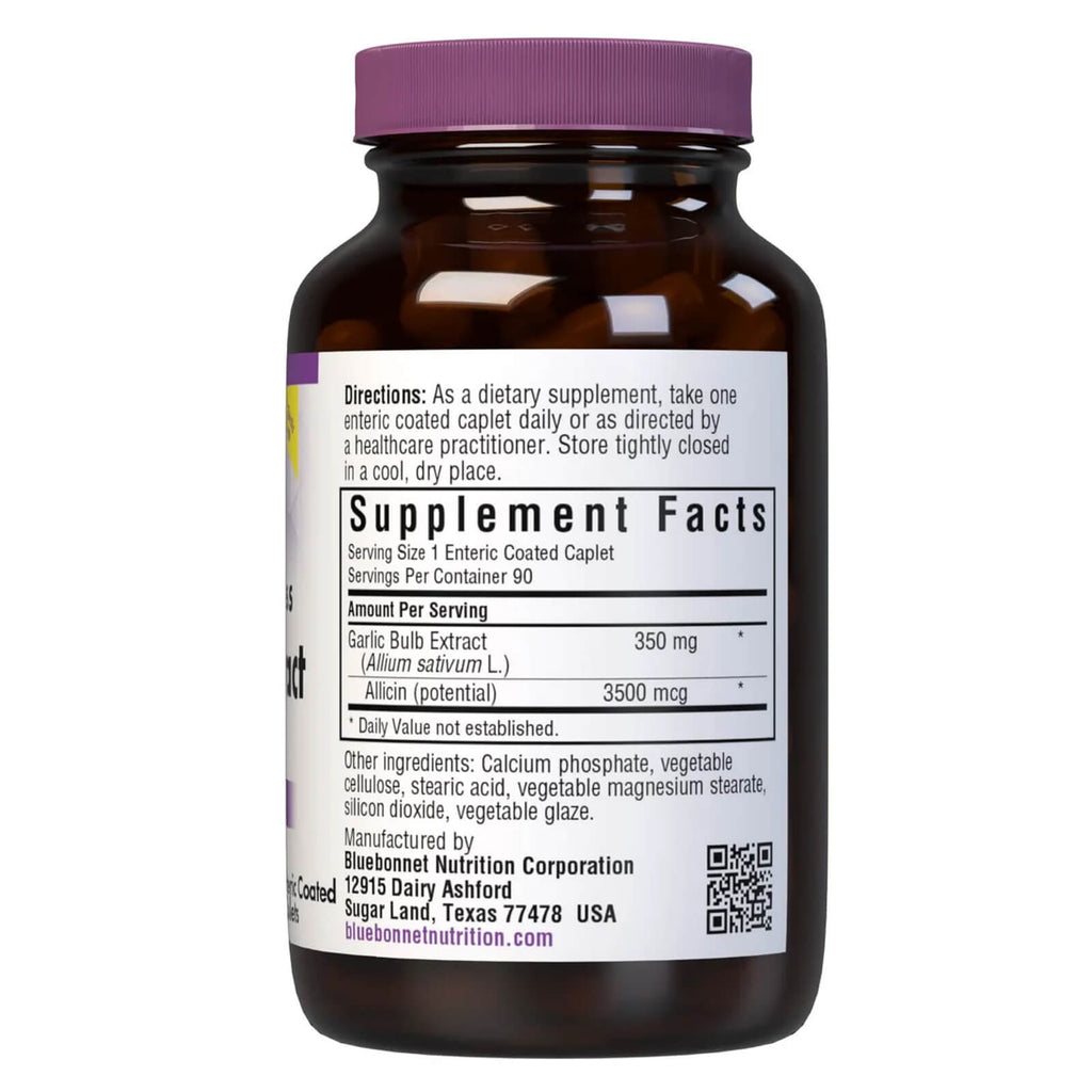 Bluebonnet’s Standardized Odor-Less Fresh Garlic Extract Enteric Coated Caplets provide 350 mg of fresh garlic extract from mature, premium-grade, non-GMO garlic bulbs containing potent allicin releasing potential. Available in easy-to-swallow enteric coated caplets, which allow the garlic actives to bypass the stomach and dissolve in the intestines to avoid garlic breath and stomach upset.