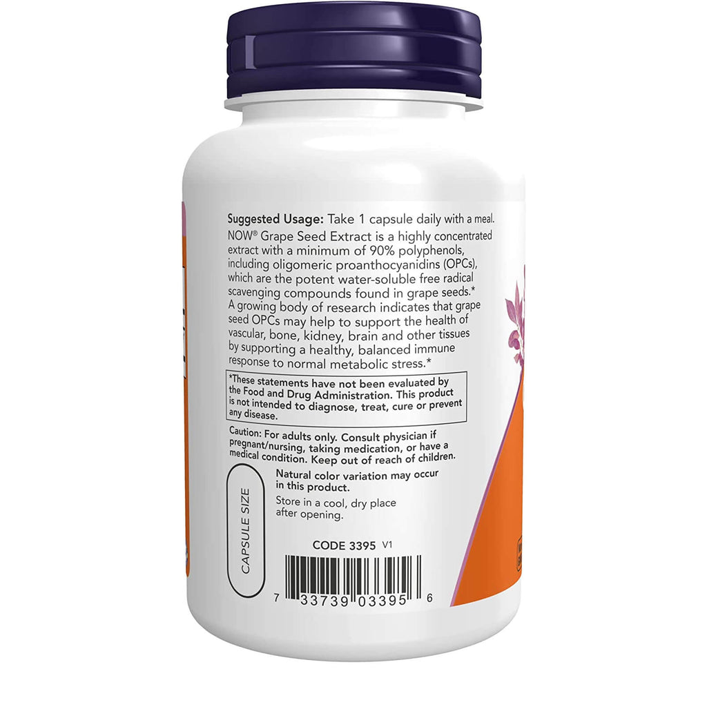 NOW® Grape Seed Extract is a highly concentrated extract with a minimum of 90% polyphenols, including oligomeric proanthocyanidins (OPCs), which are the potent water-soluble free radical scavenging compounds found in grape seeds. A growing body of research indicates that grape seed OPCs may help to support the health of vascular, bone, kidney, brain and other tissues by supporting a healthy, balanced immune response to normal metabolic stress.