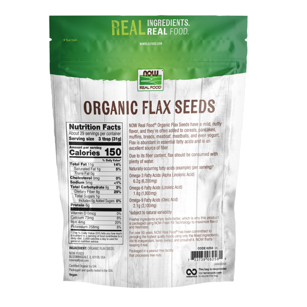 NOW Comida real® Las semillas de lino orgánicas tienen un sabor suave y nuez, y a menudo se agregan a cereales, panqueques, magdalenas, panes, pastel de carne, albóndigas e incluso yogurt.
