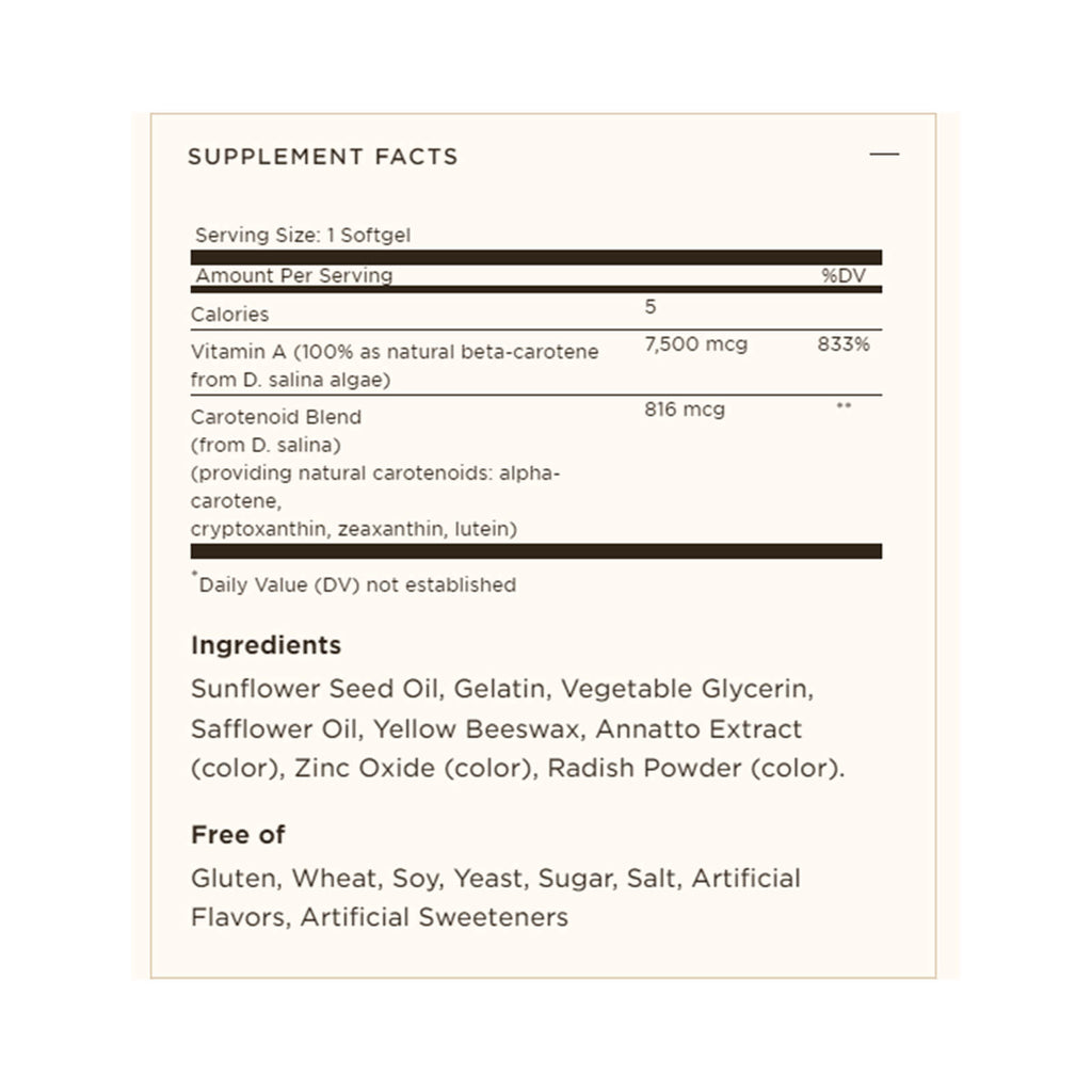 | Vitamine A (100% comme bĂȘta-carotĂšne naturel des algues de D. salina) | 7 500 MCG | 833% |