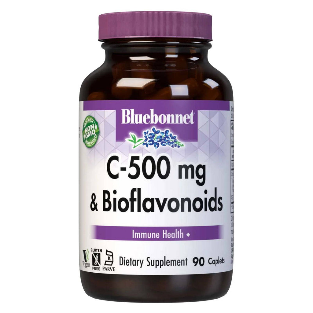 BluebonnetC-500 mg mais bioflavonóides Caplets contêm vitamina C de identidade não-OGM, preservada por identidade (IP) a partir de ácido L-ascórbico, bioflavonóides cítricos complexos de laranjas, limões, tangerinas, torquinhas e limas, além de hesperidina e rotutina. Disponível em caplets fáceis de trocar.