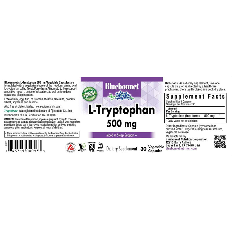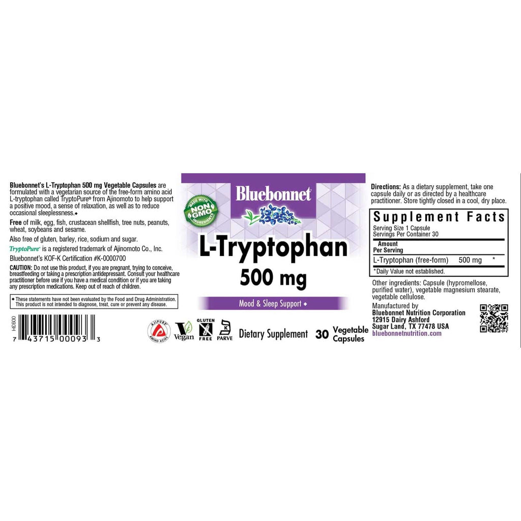 BluebonnetAs cápsulas vegetais de 500 mg de L-Triptofano são formuladas com uma fonte vegetariana do aminoácido de forma livre L-triptofano chamado Trytoptopure® de Ajinomoto para ajudar a apoiar um humor positivo, uma sensação de relaxamento, bem como reduzir a manobra ocasional.