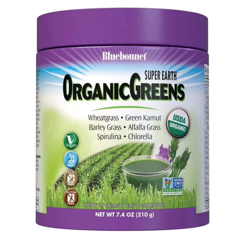 BluebonnetO Super Earth® OrganicGreens é uma mistura perfeita de verduras energizantes que combinam poderosos nutrientes alimentares inteiros de capim de trigo 100% orgânico, grama de cevada, grama de alfafa e kamut verde, além de espirulina e clorella da parede celular quebrada, sem cores adicionais, adoçantes ou flavenores. Pesquisamos o mundo para descobrir onde o clima, a temperatura e o solo glacial ou a água convergem para fornecer verduras orgânicas carregadas com poderosos fitonutrientes e uma ampla variedade de vitaminas, minerais, fibras e muito mais. BluebonnetO Super Earth® OrganicGreens é o complemento perfeito para qualquer dieta saudável, oferecendo a oportunidade de atender às cinco porções recomendadas por dia de frutas e vegetais em uma deliciosa colher. Gramíneas saudáveis, como capim de trigo, grama de cevada, grama de alfafa e kamut verde, além de Spirulina e Chlorella são alguns dos alimentos mais ricos em nutrientes do mundo. Cada grama orgânica nesta fórmula é cultivada sem fertilizantes químicos ou pesticidas. Além disso, esses alimentos super verdes são cultivados organicamente, colhidos em seu pico nutricional, imediatamente espremidos e secos a baixas temperaturas. Esse processo de fazenda para mesa é importante porque preserva a clorofila inerente e os minerais responsáveis pelas propriedades de desintoxicação e limpeza desses super alimentos. Os verdes orgânicos nessa fórmula estão envolvidos em importantes funções celulares, como restaurar a alcalinidade, aumentar a desintoxicação do fígado e fornecer fitonutrientes importantes que o corpo precisa para remover toxinas destrutivas. Embora esses processos revitalizantes e revigorantes ajudem a promover os níveis de energia, essa mistura única de gramíneas orgânicas aprovadas pelo USDA, juntamente com a Spirulina & Chlorella orgânica, também fornecem fibras e proteínas para ajudar a apoiar um trato digestivo saudável.