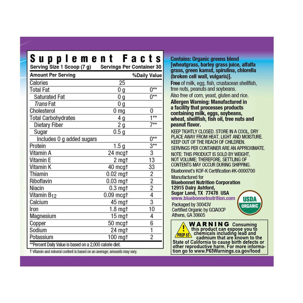 - Contém a mistura de verduras orgânicas do USDA (capim de trigo, grama de cevada, grama de alfafa, kamut verde, espirulina, chlorella) que é sem sabor, sem açúcar