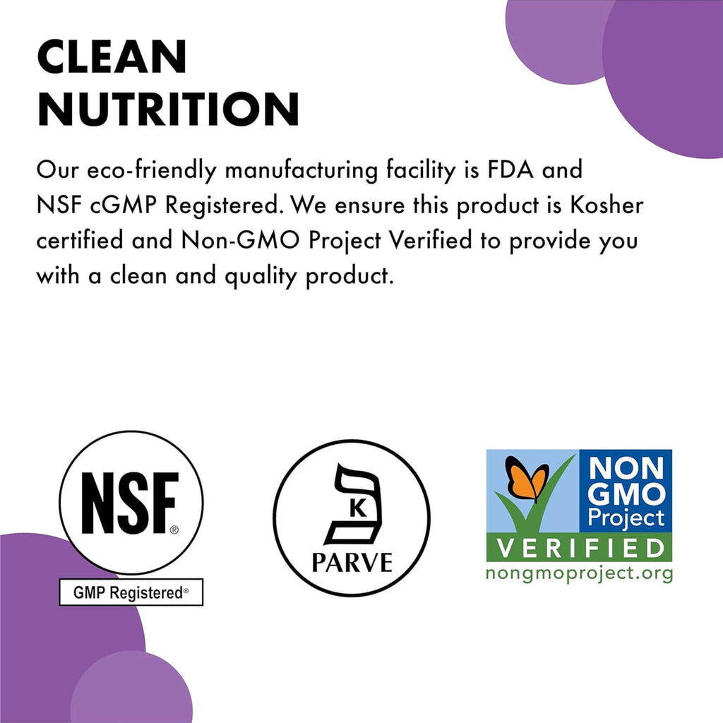 • 清洁营养 - 该产品是非转基因,纯素食,犹太洁食,无麸质,不含大豆,不含奶的产品,也没有鸡蛋,鱼,甲壳类贝类,树坚果等等!没有任何不必要的粘合剂,填充剂或添加剂来维持营养完整性。我们公式中的每种成分都进行了分析测试,以验证它们符合身份,纯度和效力的规格。